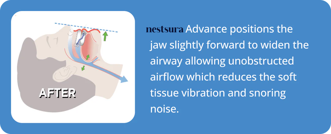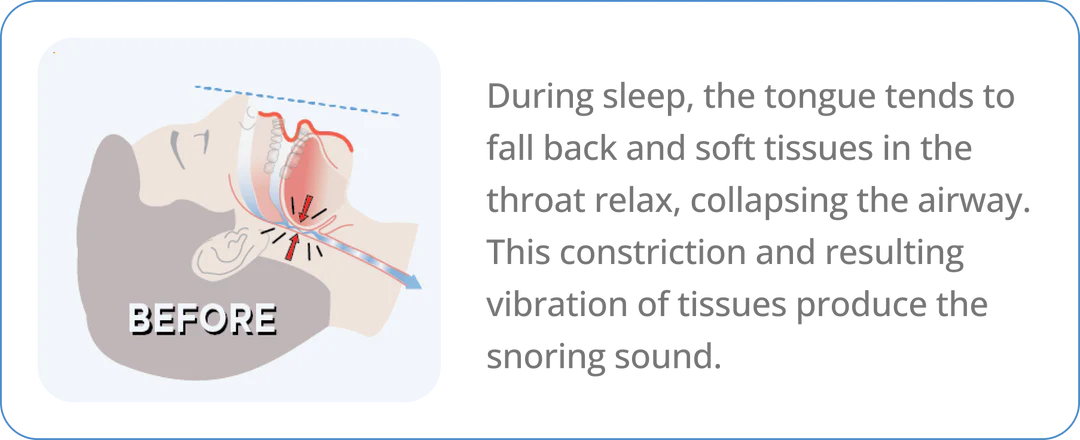 Your lower jaw gently relaxes when you sleep, letting your tongue fall back and block airflow — that’s what causes the snore. Our mouthpiece comfortably positions your jaw slightly forward, keeping your airway open all night. No wires. No noise. Just quiet, restorative sleep for both of you.