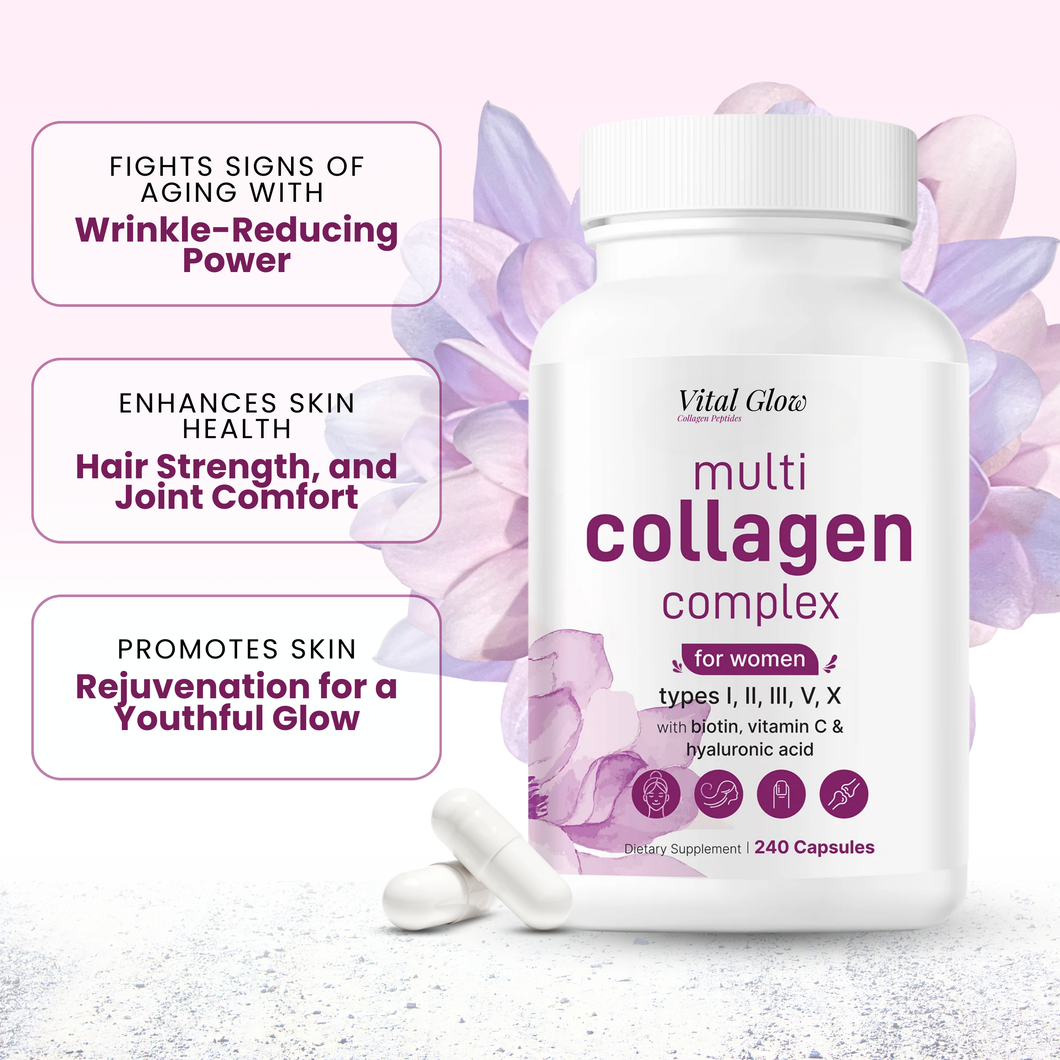 Our Multi Collagen Complex combines five premium collagen types (I, II, III, V & X) to support your skin, joints, hair, nails, and overall vitality from within. Unlike single-source collagen, this multi-type blend delivers broader, more noticeable results — all in simple daily capsules.